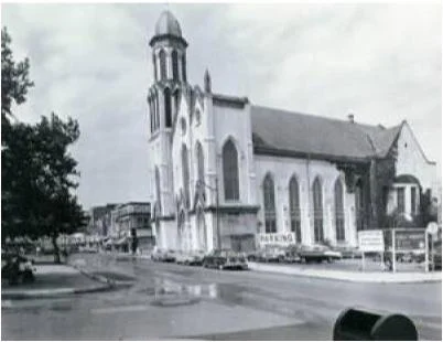 During the pastorate of Rev. A. V. Lawrence (1865-68) a lot was purchased at the corner of George and Liberty Streets for $7,700 from A. J. Buttler who owned a pottery there. In 1869-71 a Church foundation was laid on the new site and in 1876, when the State Legislature passed an act enabling the disposal of the old Church, it was sold to a Hebrew Congregation for $2,000 and the erection of the new Church begun. It was dedicated by Bishop Matthew Simpson in that year although not completed in its present form until 1896. The Chapel portion, now called the Education Building, was completed in 1885. During the twentieth century both Chapel and Sanctuary portions of the Church have undergone alterations and renovations.